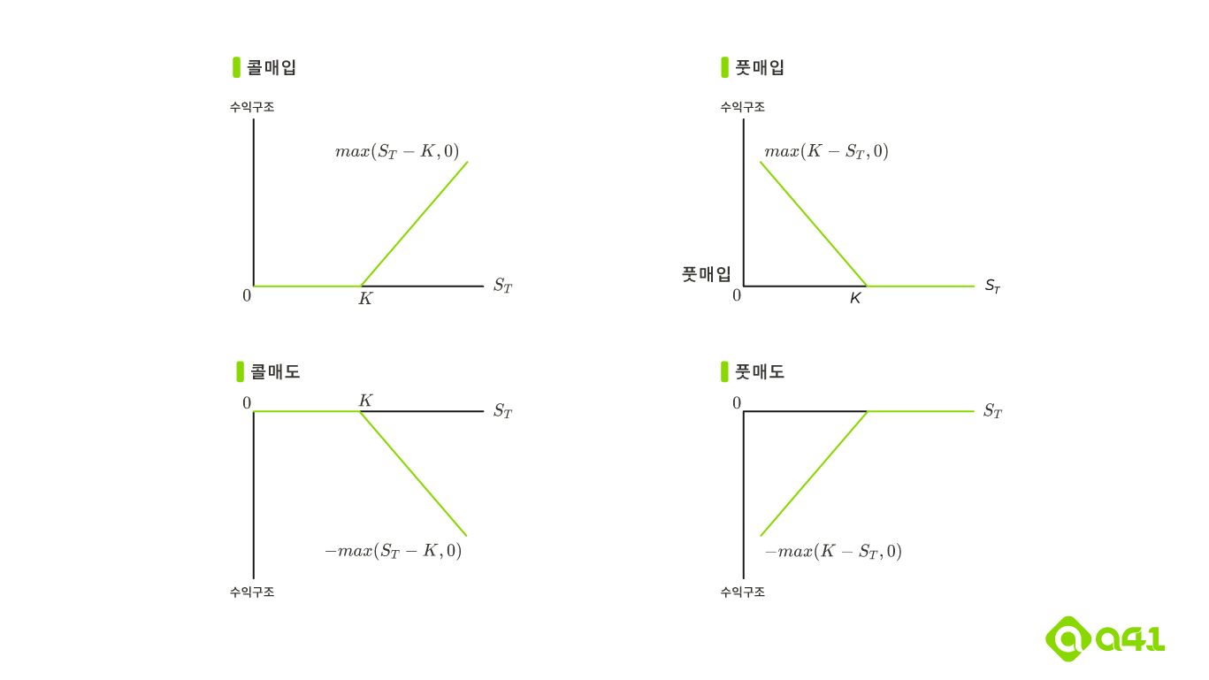 기초자산을 살 권리를 콜옵션, 팔 권리를 풋옵션이라고 하며, 추가적으로 옵션의 권리행사를 만기일(Expiration date, Maturity date)에만 할 수 있는 옵션을 유럽형(European) 옵션, 만기일 이전에 옵션 매수자가 원하는 때에 언제나 권리행사를 할 수 있는 미국형(American) 옵션이라고 합니다.